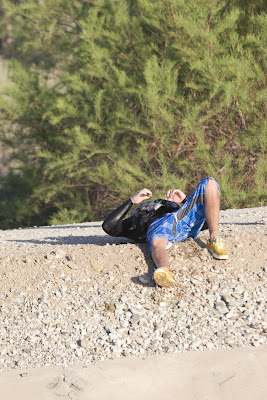 Later in the afternoon we headed out to these irrigation canals about 15 min away from where we were staying. One of the local guys took us there to show us some possible riding spots. We checked out a few, but James wasn't too impressed and wanted to look at other areas. So we headed down the road more and came to a area with a dam with rushing water. That was pretty extreme, but James saw a spot a few yards down that he wanted to try. It was a spot that had a little drop so it had some rushing water, but not as fast as the dam. But it still looked pretty sketchy. James wanted to try that spot so he geared up.